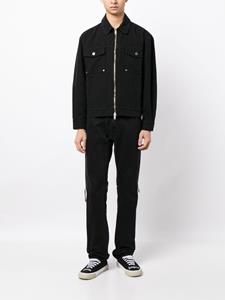 Zwart, katoen, denim, geborduurd logo op de voorkant, zilverkleurige studs, knopen met logo-reliëf, klassieke kraag, tweeweg ritssluiting aan de voorzijde, lange mouwen, knoopmanchetten, twee borstzakken met klep en twee steekzijzakken.