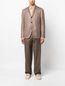 Taupe, broche detail, V-hals, gekartelde revers, knoopsluiting aan de voorkant, opgestikte borstzak, twee opgestikte voorzakken, lange mouwen, knoopmanchetten en rechte zoom.