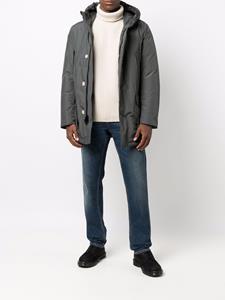Klassieke capuchon, gewatteerd design, meerdere opgestikte zakken, knoopsluiting en logoprint bij de hals. Materiaal: gemixt katoen.