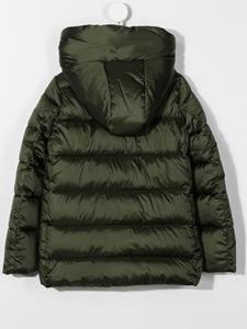 Olijfgroen, logopatch op de mouw, ritssluiting aan de voorzijde, klassieke capuchon, gewatteerd design, lange mouwen en rechte zoom.