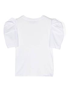 wit stretch-katoen popeline textuur/jersey logo versiering pailletten versiering ronde hals korte pofmouwen rechte zoom
