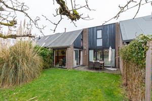 Via de schuifpui in de woonkamer stap je zo de tuin in, waar je op het terras of het grasveld kunt genieten van de zon en het eerder genoemde uitzicht op de boomgaard. De tuin ligt op het zuiden, dus zonliefhebbers hebben van de late ochtend tot de avond heerlijk zon. Er staat een tafel met vier stoelen klaar en er is een parasol voor wat schaduw.