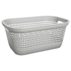 Wasmand gemaakt van kunststof(pp) in de kleur beige met een inhoud van maar liefst 45 liter. Afmetingen: 59 x 38 x 26 cm. Wasmand rotan gevlochten. Deze wasgoedmand weegt slechts 1.3 kilo. Dit artikel heeft handvaten om deze makkelijk te kunnen verplaatsen.