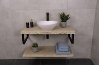 Dit prachtige badmeubel is gemaakt van massief eiken dat gedroogd en geschaafd is. Het meubel wordt onbehandeld geleverd, zodat u zelf kunt kiezen hoe u het wilt afwerken. De voorkant van de wastafelbladen hebben een natuurlijke vorm. De wastafelbladen hebben daarom een diepte van ongeveer 45cm. Het badmeubel 110cm is voorzien van 2 zwarte L-beugels en 2 zwarte handdoekbeugels. Omdat het meubel zonder gaten geleverd wordt bent u helemaal vrij om zelf de locatie van de waskom te bepalen. Zo kan het meubel met diverse verhoogde wastafelkranen gecombineerd worden of met een inbouw wastafelkraan. De meegeleverde witte waskom is gemaakt van keramiek en heeft een mooie organische vorm. Deze wastafelbladen worden voor u op maat gemaakt. Afwijkende maatvoering is daarom ook mogelijk. Neem contact op met onze verkopers voor meer informatie!