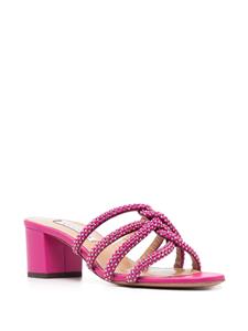 Fuchsia, kalfsleer, verfraaid met kristallen, open neus, binnenzool met merk en blokhak.