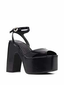 Plateauzool, enkelbandje met gespsluiting, open neus, binnenzool met logo en hoge blokhak. Materiaal: leder.