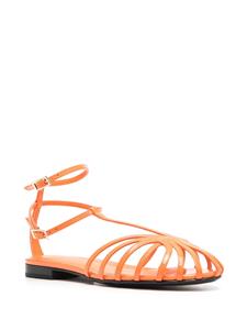 Pompoenoranje, kalfsleer, enkelbandje, gespsluiting aan zijkant, amandelvormige neus, binnenzool met merk en lage hak.
