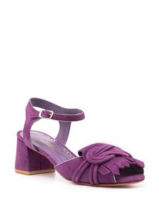 Lederen voering, kwastjesdetail, geknoopt detail, open neus, enkelbandje met gespsluiting, binnenzool met logo en halfhoge hak.