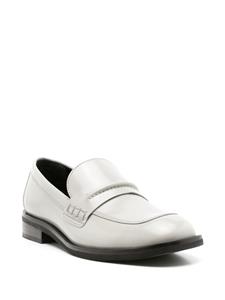 Lichtgrijs, kalfsleer, leren binnenzool met logo, vierkante neus, slip-on stijl en halfhoge blokhak.