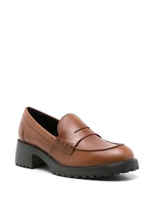 Cognac bruin, leer, ronde neus, penny loafer stijl, slip-on stijl, lage geribbelde hak en binnenzool met merk.