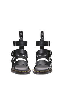 Gekruiste band, zilverkleurig materiaal, enkelbandje met gespsluiting, gespsluiting aan zijkant , open neus, lipje bij de hiel, contrasterende stiksels, leren binnenzool met logo en chunky rubberen zool. Materiaal: kalfsleer.