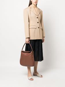 Bruin, kalfsleer, goudkleurig materiaal, discrete stiksels, een enkel schouderbandje en omslag met magnetische sluiting.
