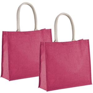 2x stuks jute fuchsia roze boodschappentassen met katoenen hengsel. Fuchsia roze boodschappentassen van jute materiaal met hengsels van katoen en een klittenbandsluiting. Afmeting ongeveer: 42 x 36 x 15 cm.