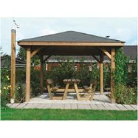 Deze kiosk van Solid uit gecertificeerd en geïmpregneerd grenenhout beschikt over 4 steunpalen. Deze kiosk is ideaal om uw gasten voor een lekker maaltijd te ontvangen en hen tegen regen en zon het hele jaar door beveiligen. Inbegrepen: zwarte shingles