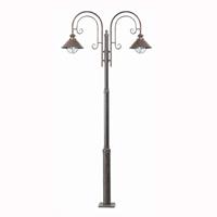 Imposante mastlamp Nautica uit beruin geoxideerd ijzerEen echte verrijking voor elk buitengedeelte is deze fantastische mastlamp met twee buitengewone kappen. Het totaal beeld van de lamp is adembenemend mooi. De hoge ijzeren mast wordt naar boven toe smaller en is voorzien van twee heerlijk swingende armen die met kunstige vormen zijn versierd. Edel glas in kogelvorm rond de verschijning harmonisch af.