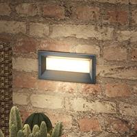 Robuuste LED-inbouw-wandlamp Lachlain van aluminium Zo is de moderne LED-wandinbouwarmatuur Lachlain ideaal voor de verlichting van trappenhuizen in de buitenruimte. Met zijn hoekige, langwerpige vorm en de donkergrijze aluminium behuizing is hij niet alleen robuust, maar ook zeer modern vormgegeven. De geïntegreerde LED-technologie is verborgen achter een witte kunststof diffuser, die het licht gelijkmatig en zonder verblinding in de omgeving uitstraalt. Niet alleen het trappenhuis wordt veilig verlicht, maar de LED-inbouwarmatuur Lachlain zorgt ook voor heldere oriëntatiepunten in het donker op de buitengevel. Energie-efficiëntieklasse: A+