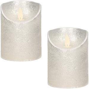 2x Zilveren LED kaarsen / stompkaarsen met bewegende vlam 10 cm. Zilveren wax stompkaars met bewegende vlam verlichting die de illusie geeft van echt kaarslicht. Deze kaars werkt op batterijen. Aantal kaarsen: 2x. Kleur: Zilver. Formaat: 7,