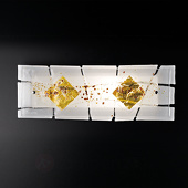 Design-wandlamp Frame schept een chique sfeerFrame is vervaardigd uit gesmolten glas met transparante en witte elementen. De fraaie kap wordt gesierd door in het glas verwerkte vlokken. De prachtige decoratie van bladgoud completeert de perfecte glans van de wandlamp, die bij het inschakelen van het licht prachtig begint te blinken en de woonkamer een chique elegantie geeft.