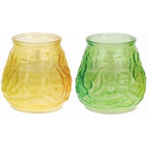 Set van 2x windlichte geurkaarsen citronella anti muggen groen en geel glas. Deze kaarsen verspreiden frisse geuren van citroen. Citroengeur/citrusgeur verjaagt muggen. Formaat: diameter 9 cm, hoogte 10 cm. Aantal branduren: ongeveer 48 uur. Materiaal: wax/was, paraffine, glas. Geur type: fris, verfrissend. Geschikt voor gebruik binnenshuis (binnen/indoor) en buitenshuis (buiten/outdoor). bestaande uit 1x Windlicht geurkaars citronella anti muggen geel glas, 1x Windlicht geurkaars citronella anti muggen groen glas