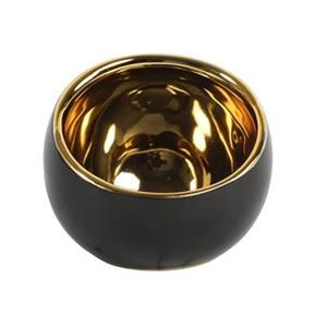 Luxe theelichthouder of kaarsenhouder voor waxinelichtjes in de vorm van een Art Deco ei, gemaakt van keramiek in de kleuren zwart/goud. Afmetingen: D10 x H9 cm. Serie: Veneta. De voorzijde is lager dan de achterzijde zodat de reflectie beter naar