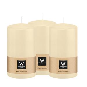 3x cilinderkaars/stompkaars 13 x 7 cm met 52 branduren. Deze *stijlvolle cilinderkaars*, ook wel stompkaars genoemd, voegt een warme en sfeervolle uitstraling toe aan elke ruimte. Met zijn *strakke afwerking* en klassieke kleur creme wit past de kaars bij elk interieur, van modern tot landelijk. Rechte zuilkaars zonder geur met gladde afwerking in de kleur creme wit. Deze stompkaarsen zijn van hoge Duitse kwaliteit, wat zorgt voor een lange brandduur en weinig roetvorming. Je kunt meerdere kaarsen gebruiken als sfeermakers, bijvoorbeeld tezamen gepresenteerd op een kaarsenplateau in verschillende formaten en kleuren. Deze kaarsen zijn door de lange levensduur ook uitermate geschikt voor in de horeca. Aantal branduren: 52 uur. Materiaal: wax/was, paraffine. Geurloze sfeerkaarsen cilinder/stomp kaarsen. Woondecoraties kaarsen versiering.
