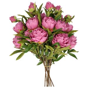 Kunstbloemen boeket pioenroos roze. Deze pioenrozen Spring Dream roze heeft 2 bloemen met bladeren, de bloemen hebben een doorsnee van ca. 10 en 8 cm. De knop heeft een doorsnee van ca. 4 cm. Dit kunstbloemen boeket van pioenrozen in de kleur roze bestaat uit 8 stelen met prachtige bloemen. Lengte steel: ca. 73 cm. Lengte tot bladaanzet: ca. 37 cm. Materiaal: plastic/polyester.