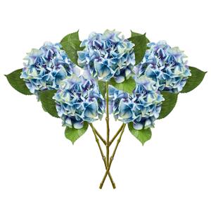 5x kunstbloem Hortensia tak Challenge 47 cm blauw. Deze hortensia kunst tak wordt als losse steelbloem geleverd en kan in combinatie met andere kunstbloemen tot een mooi boeket worden verwerkt, of is mooi als losse tak in een vaas. De kunsttak heeft 1 mooie grote bloem en zijtakjes met blaadjes en voelt zijdezacht aan. Prachtige kwaliteit, en niet van echt te onderscheiden. Formaat: 47 cm. Materiaal: kunststof/zijde. *Voordelen* - Onderhoudsvrij, je hoeft niet te denken aan water geven. - Het hele jaar rond prachtig in bloei. - Niet van echt te onderscheiden, voelt zijdezacht aan.