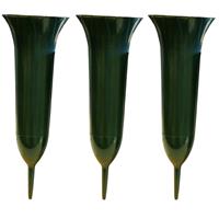 3x Groene kunststof grafvazen 37cm. Deze vazen zijn makkelijk te plaatsen naast of op het graf met de prikker aan de onderkant. Materiaal: kunststof. Formaat: 12,5 x 37 cm. U ontvangt 3 grafvazen. Grafvazen grafkaarsen.