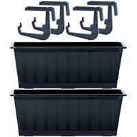 2x Kunststof Agro rotan plantenbakken/bloembakken antraciet grijs 9 liter met ophangbeugels. Complete balkonbakken set. Kras en stootvaste rechthoekige bloembak/plantenbak met een subtiele reliefopdruk De bloembakken/plantenbakken zijn geschikt voor binnen (indoor/binnenshuis) en buiten (outdoor/buitenshuis) gebruik. Serie: Agro Case. Formaat per bak: 18 x 50 x 14 cm. Inhoud per bak: ca. 9 liter. Wordt geleverd met 4x kunststof balkon/ophangbeugels. Formaat per beugel: verstelbaar van 20 tot 25 cm. Balkon balustrade/reling bakken - Balkonbakken - Balkon bloembak/plantenbak. bestaande uit 4x verstelbare kunststof balkonbeugels 20 tot 25 cm antraciet , 2x Antraciet kunststof Agro plantenbakken/bloembakken 50 cm