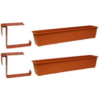 Set van 4 plantenbakken terracotta rechthoekig 80 cm met 8 verstelbare railing beugels. Afmeting plantenbak: 80 x 17,5 x 14,5 cm. Materiaal plantenbak: polypropyleen (plastic/kunststof). Beugels te gebruiken voor een railing t/m 14 cm . Materiaal: metaal. Te gebruiken voor balkonbakken tot 25 kg. bestaande uit 4x Set van 2 verstelbare metalen balkonbeugels voor een railing t/m 14 cm in de kleur terracotta, 4x Plantenbak terracotta rechthoekig 80 x 17,5 x 14,5 cm