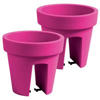 2x stuks balkon plantenpot/bloempot fuchsia roze met inhoud van 5 liter van kunststof. Formaat: Dia ca 25 cm. Hoogte 22,5 cm. Kras en stootvast, zonder gaten. Geschikt voor buiten gebruik. Tuin en balkon reling plantenpotten/bloempotten/bloembakken. Vorstbestendig ja. Met relingklem.