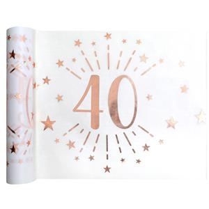 2x stuks verjaardag leeftijd thema tafelloper wit polyester stof op rol 30 x 500 cm, met 40 jaar opdruk, in de kleur wit/rose goud. Materiaal: 100% non-woven polyester. Decoratieve licht transparante loper om uw tafel feestelijk mee aan te kleden voor een verjaardagsfeest. Makkelijk op maat te knippen naar het gewenste formaat. Af te nemen met een licht vochtige doek.